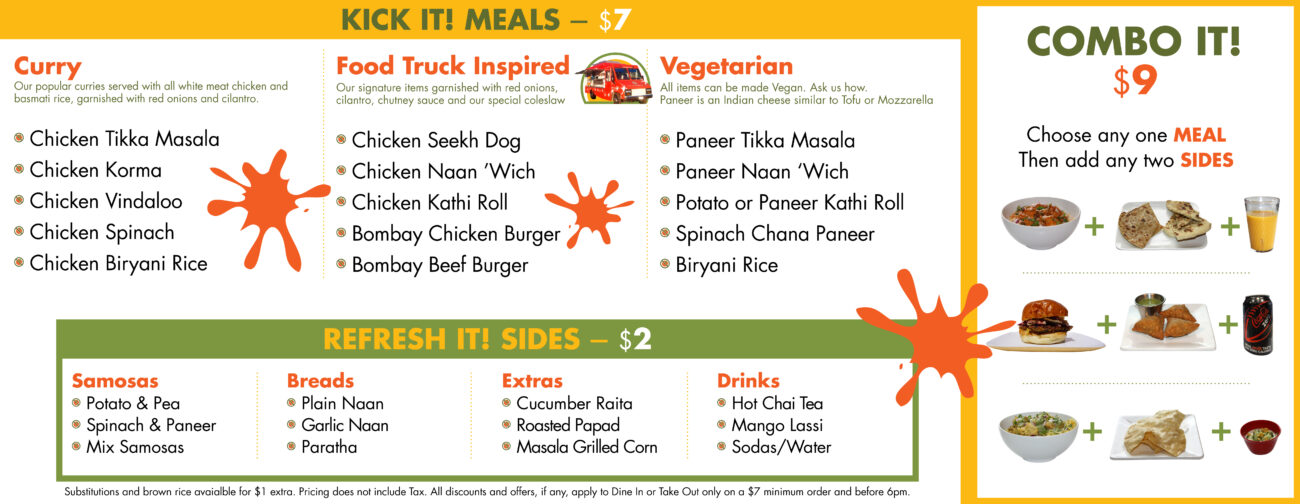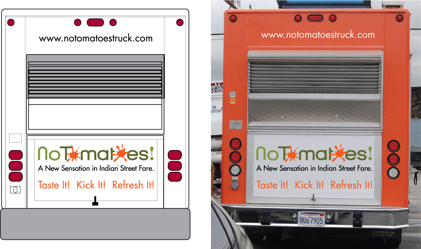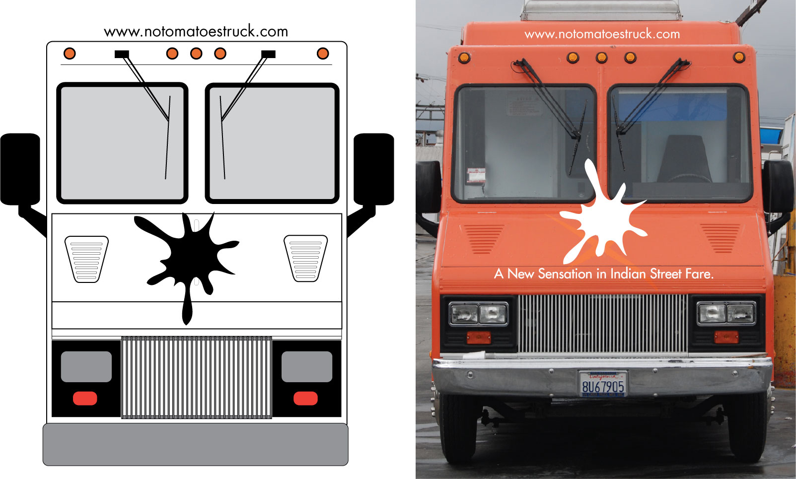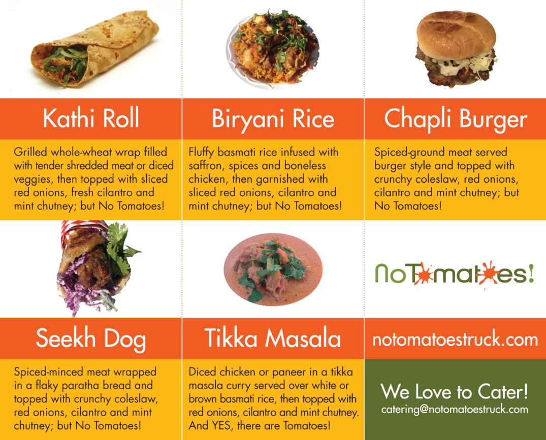 Objective: Create colorful branding and collateral focusing on the brand name “No Tomatos” for this brick and mortar Indian restaurant turned food truck.